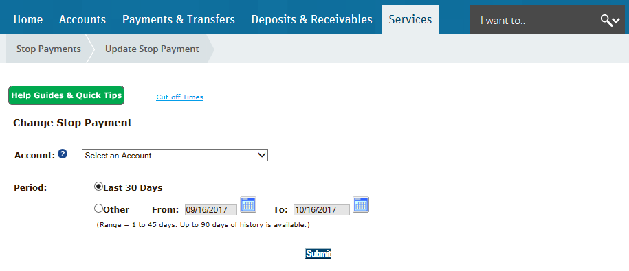 - Hover over the Services menu within SVB Online Banking and click Update Stop Payment.